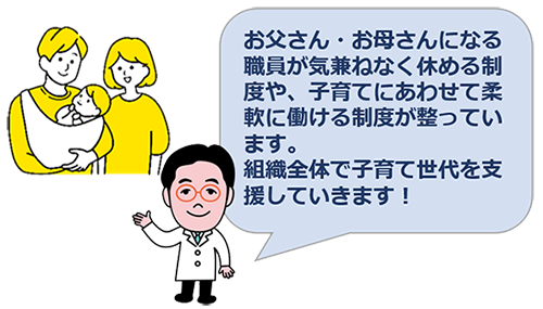 当法人では両立支援制度が整っているため、希望者が申請しやすい環境を作ると共に、復職しやすい環境を作るために全職員に制度の周知を図り、組織全体で子育て支援が出来る風土の醸成に取り組む。