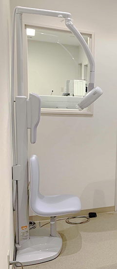 耳鼻咽喉科領域の専用一般撮影装置であり、その特徴として、X線管球と撮影台が自由に動くので、車椅子の患者さんでも、無理のないそのままの姿勢での撮影が正確に行えます。