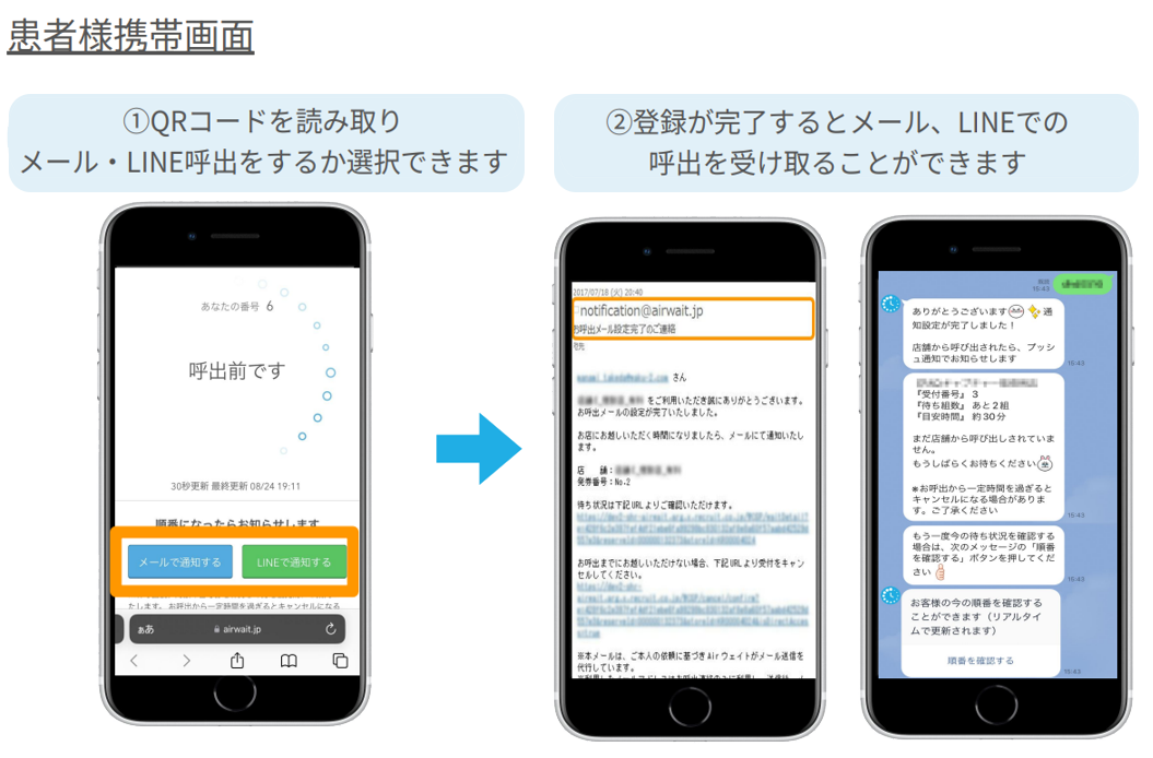 • 呼出しメールやLINE呼出しは設定しないとご利用になれません。受付票のQRコードからご登録ください。