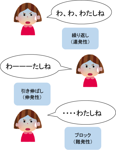 吃音とは、言葉の一部を繰り返したり引き伸ばしたり、言葉が詰まってしまったりと、滑らかに話すことができない症状のことを言います。図のようなくり返し・引き伸ばし・ブロックと3つの中心的な症状があります。