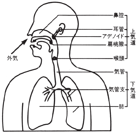 私たちは、呼吸をするとき空気は鼻や口から入り肺に達します。この空気の通り道を気道と言います。図のように気道は上気道と下気道に分けられます。
